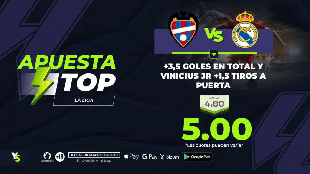 Así, la Apuesta Top del Levante vs Real Madrid queda montada. Si se marcan más de 3 goles y Vinicius remata a puerta en más de una ocasión, la cuota que obtenemos en YoSports es 5.00.